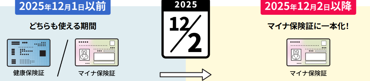 ・現在の健康保険証(青色のプラスチックカード)は、2025年12月2日より病院の窓口などで利用ができなくなります。12月2日以降はマイナ保険証または資格確認書(黄色のプラスチックカード)を病院の窓口に提示することにより、保険診療が可能です。※ マイナ保険証への登録・切替手続き方法はこちらで確認!