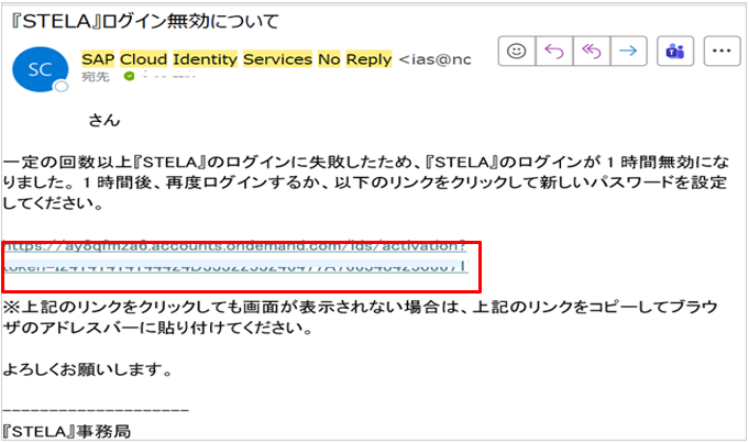 3.ご自身のメールアドレスに 「【STELA】パスワードリセットについて」 という件名のメールが届きます。 (メールが届かない場合は、受信設定や迷惑メール設定など今一度ご確認ください) メールを開くと、下記の内容が表示されますので、本文に記載のURLをクリックしてください。