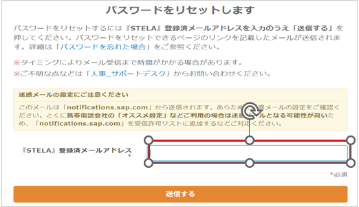 2.「 『STELA』 登録済みメールアドレス」 欄に、STELAに登録の メールアドレス(半角英数字、記号)を入力して 「送信する」 を クリックしてください。