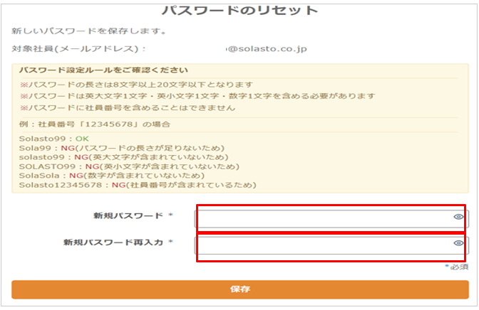 4.URLをクリックすると下記画面が表示されますので、新しいパスワードを2か所に入力してください。 「保存」 をクリックすると、パスワードが変更されます。